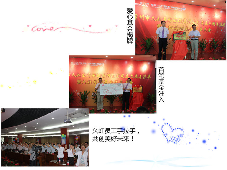 2012年7月28日上午,公司成立九周年慶典暨久虹愛心基金成立大會隆重舉行,公司總經(jīng)理莊小金先生發(fā)表了熱情洋溢的講話,為我們介紹了公司發(fā)展歷程及發(fā)起成立愛心基金的由來、設(shè)想、基金會宗旨、性質(zhì)、基金會運(yùn)作模式。隨后莊總與愛心基金會負(fù)責(zé)人共同為久虹愛心基金會揭牌,愛心基金會會長袁自安宣讀了愛心基金會章程,莊總向愛心基金會捐贈(zèng)首筆啟動(dòng)資金20萬元。