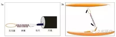 2009 年兩位日本學者 Sakamoto 和 Osada 以彈簧、金屬夾和尼龍圈為基礎設計出另一種體內(nèi)牽引技術,并以兩人名字的首字母命名為 S-O 金屬夾牽引技術。該方法由金屬夾彈力圈聯(lián)合牽引法衍變而來,以彈簧替代彈力圈,力求獲得更大的伸縮性,來適應大的、表淺性的結(jié)腸早期腫瘤的 ESD 切除(圖 3)。