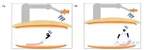 圖 4 磁力錨牽引技術的不同變體(4a. 使用單錨點磁力錨牽引技術的流程圖;4b. 使用雙錨點磁力錨牽引技術的流程圖,因形成三角形平面,磁鐵處于頂點,故遠離剝離面,能提供更廣闊視野)