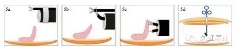 3. 另外一種更直接的方式是,把第二枚金屬夾與絲線同時固定于對側(cè)黏膜上,使剝離組織產(chǎn)生來自對側(cè)的張力,見圖 1c。但此種方法仍存不足,一是絲線本身只能提供定向拉力;二是絲線本身沒有收縮性,隨著剝離面的加大,絲線的張力會減小,其作用會隨之減弱或消失。