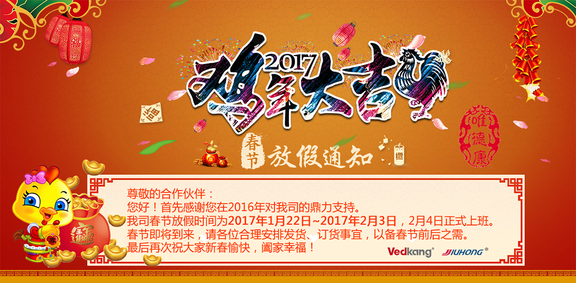 為了歡迎傳統(tǒng)的新春佳節(jié),根據(jù)國(guó)家規(guī)定和我公司的具體情況,我司春節(jié)放假時(shí)間為2017年1月22日至2017年2月3日,2月4日正式上班。